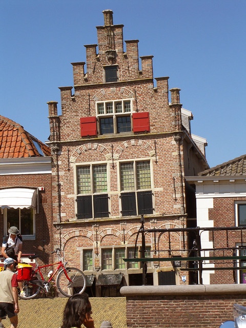 But what’s the hurry? This town of 8000 is packed with charm. There is a central square. On one side is a typical tall house, leaning a few degrees as happens here when the pilings can’t keep it upright. I imagine all the tables and chair legs are cut so that you can sit flat and not have things roll off the table during dinner. At the square there is a large bricked hump over which you climb to get to the other side of the street. It encapsulates the river Ej. I have seen this unusual feature elsewhere in Holland.